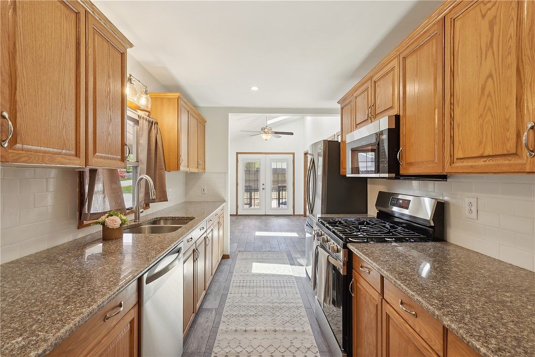 This galley kitchen features a long, narrow layout with parallel countertops and cabinetry, creating an efficient cooking space. Warm-toned oak cabinets with silver hardware line both sides, complementing the speckled brown granite countertops. A white subway tile backsplash adds a classic touch, enhancing brightness against the soft beige walls. Stainless steel appliances, including a double-door refrigerator, gas stove, microwave, and dishwasher, provide a modern contrast. A window over the sink is framed by neutral-toned curtains that soften the room. Wood-look flooring runs throughout, with a patterned runner rug adding warmth and texture. The kitchen opens toward a dining or living space flooded with natural light through double glass doors.