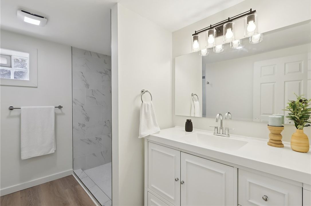 This bathroom features a clean and modern aesthetic with a bright and airy feel. The vanity is sleek with white cabinetry and a smooth, solid surface countertop that integrates a rectangular sink. Above it, a large mirror is complemented by a stylish light fixture with four clear glass-covered bulbs. The faucet and hardware are polished chrome, enhancing the contemporary look. Adjacent to the vanity, a walk-in shower with large marble-effect tiles is enclosed by a simple glass panel. White walls and a small frosted window add to the natural light, while wooden floors introduce a warm contrast. Simple accessories like a hand towel, black soap dispenser, and small potted plant provide subtle yet elegant touches.
