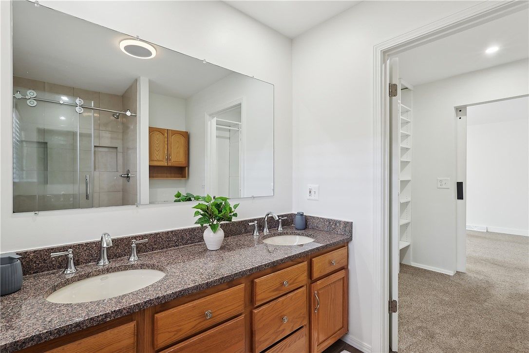 This bathroom features a dual-sink vanity with a speckled granite countertop complemented by light wooden cabinetry that adds warmth against crisp white walls. A large frameless mirror spans the length of the vanity, enhancing natural light and the sense of space. Modern chrome faucets and a small, simple potted plant bring subtle elegance. Visible through the mirror’s reflection is a glass-enclosed shower with neutral tile, while an open doorway shows a carpeted adjoining room with built-in shelving, creating a seamless transition and adding practical storage. The overall design is clean, functional, and inviting.