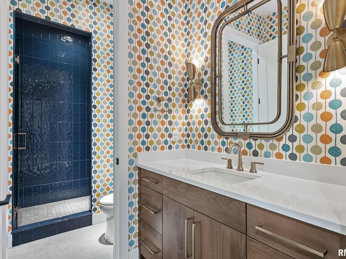 This bathroom combines retro-inspired wallpaper with modern finishes for a fresh, lively atmosphere. The walls are adorned with a playful pattern featuring multicolored circular shapes in blue, orange, mustard, and gray, creating visual interest. A wooden vanity with clean lines supports a sleek white countertop and undermount sink, paired with brushed metal fixtures that echo the mid-century modern vibe. Above the sink, a large, rounded rectangular mirror with a multi-layered metal frame adds depth. Adjacent is a walk-in shower, fully tiled in glossy, deep navy blue tiles that contrast sharply with the patterned walls, emphasizing the shower space. Soft lighting from elegant metallic sconces complements the overall aesthetic.