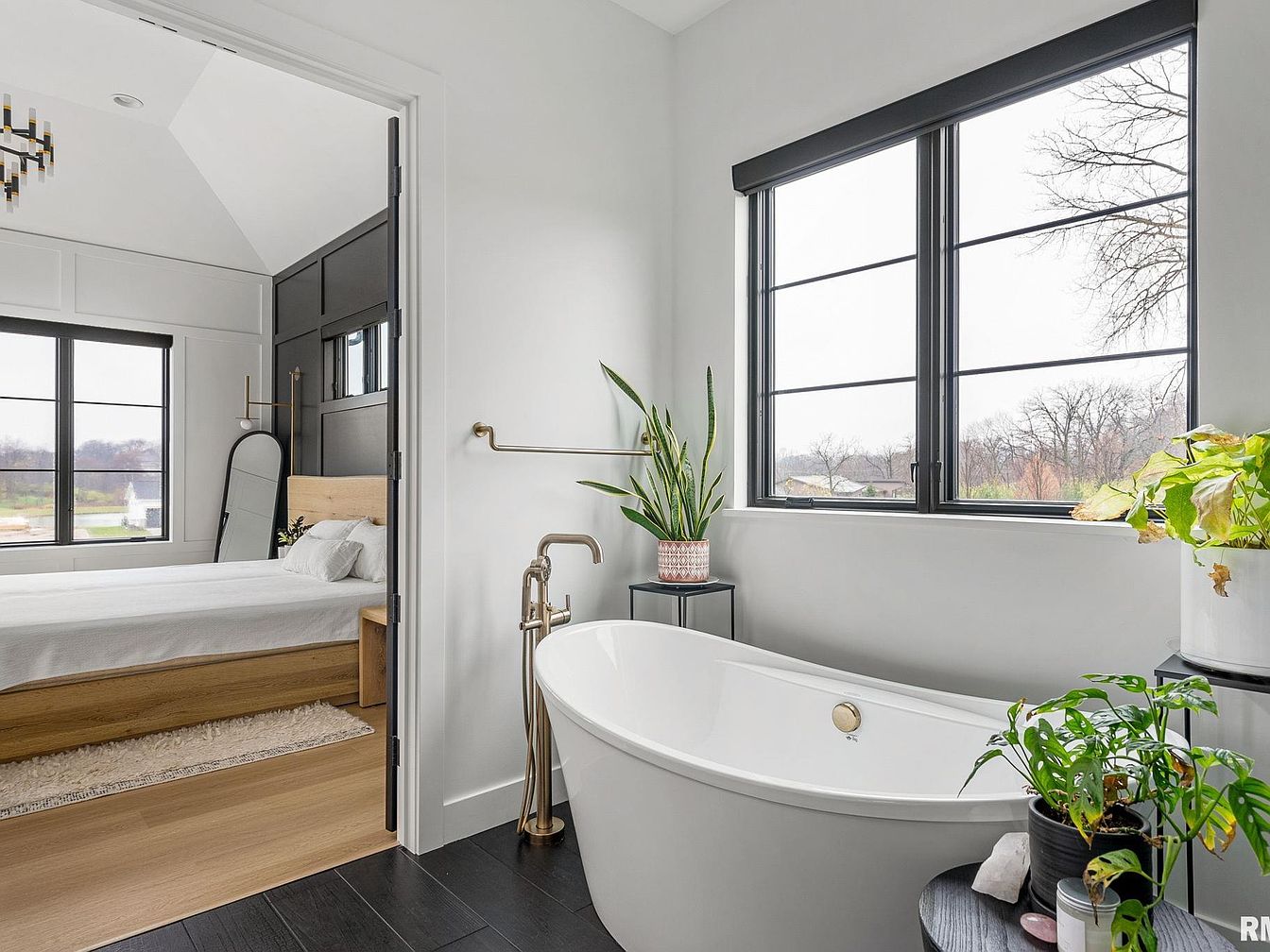 This serene bathroom features a sleek freestanding white bathtub positioned under black-framed windows that invite natural light and a view of the outdoors. The black floor tiles contrast sharply with the white walls, creating a modern monochromatic palette accented by brass fixtures for warmth and elegance. A nearby black side table holds green potted plants, adding a touch of nature and freshness to the space. Through an open doorway, a bedroom comes into view with light wood flooring, a wooden bed frame, and neutral bedding, maintaining a clean, contemporary aesthetic throughout both areas.