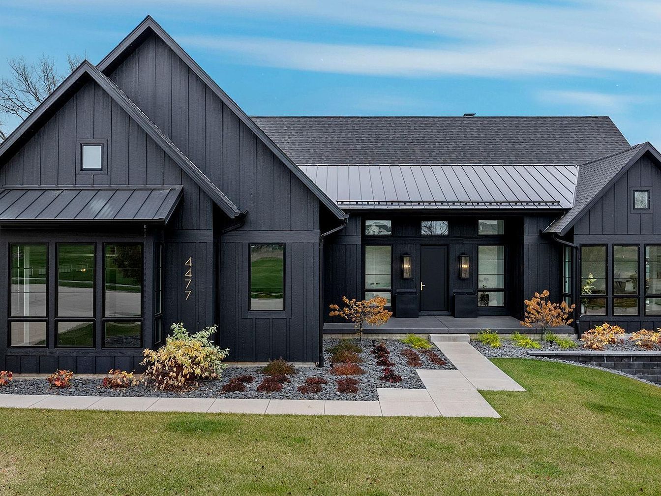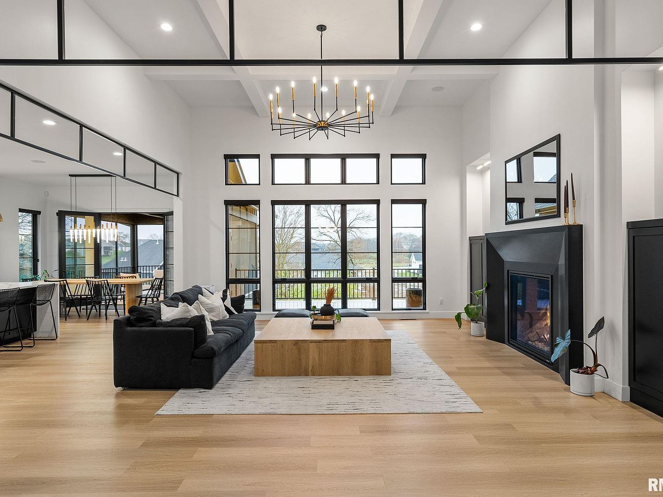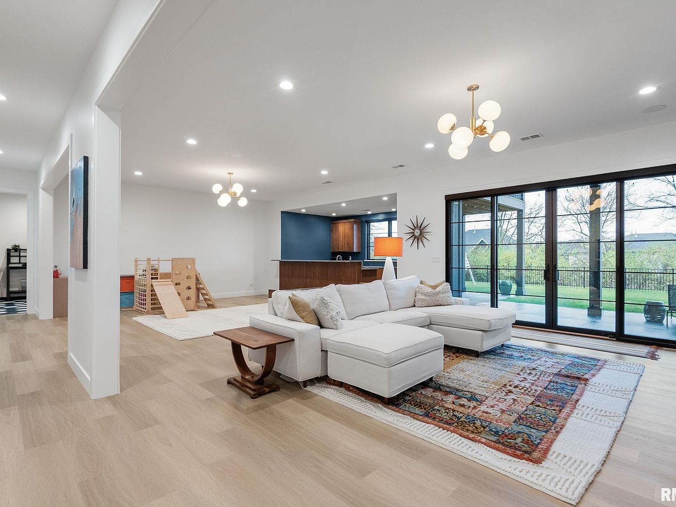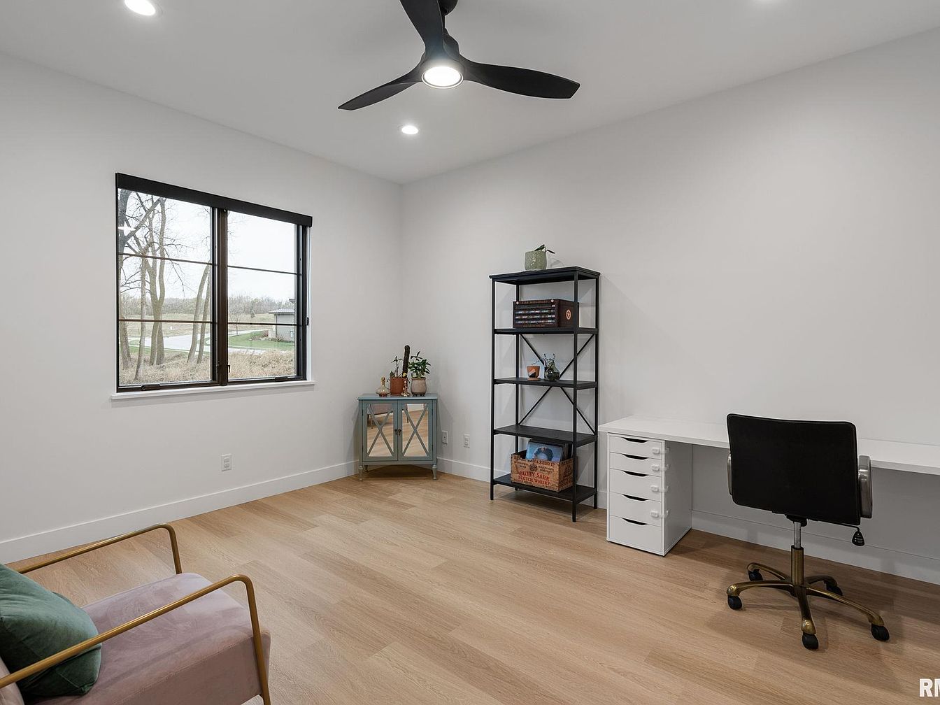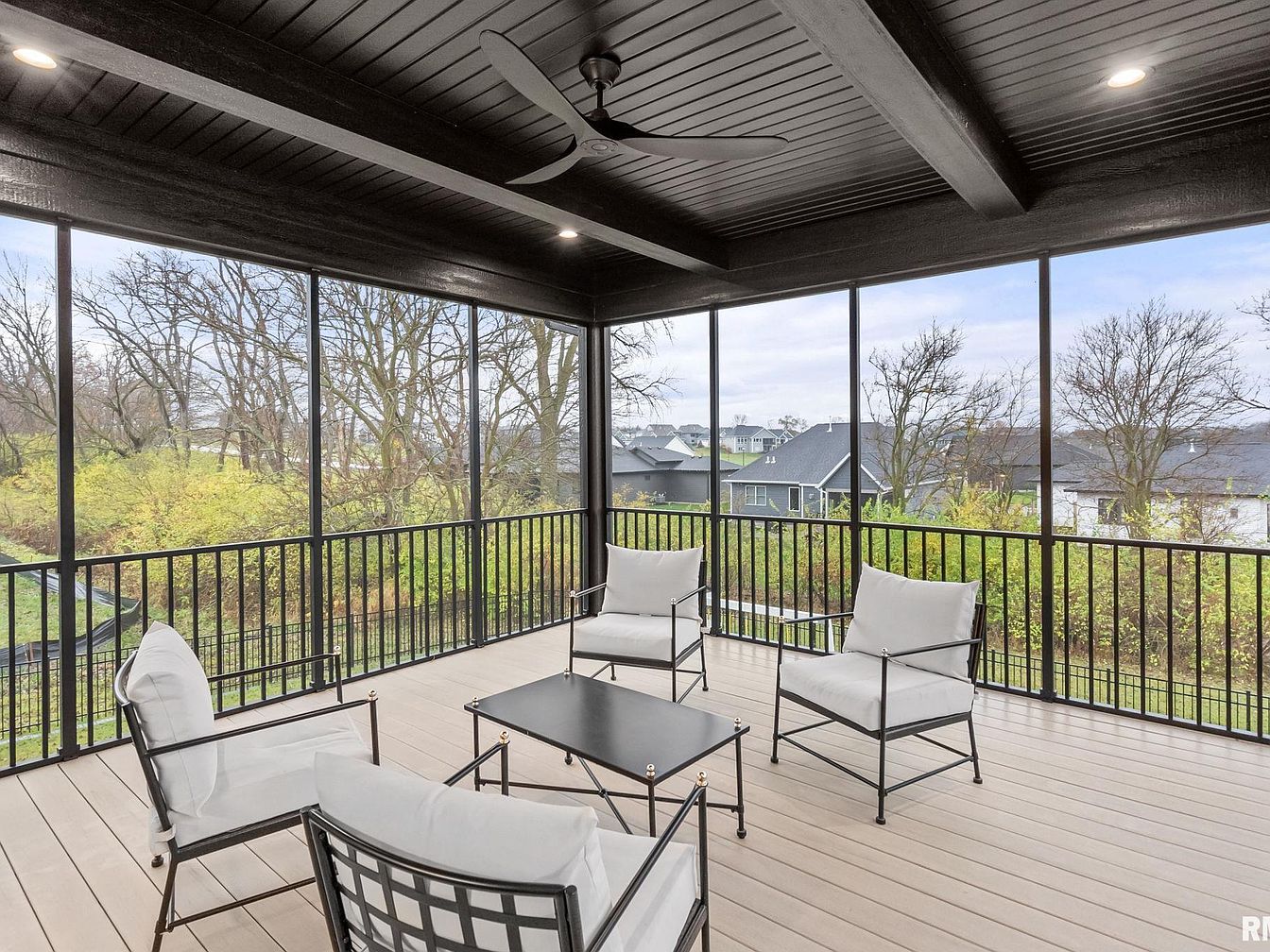 “The Onyx Retreat” is a stunning contemporary ranch home designed and built by Windmiller Design Build, located in the highly sought-after Woodlands neighborhood in Bettendorf, IA. This elegant residence offers over 4,500 square feet of luxurious living space thoughtfully designed to blend style and comfort. Featuring 4 bedrooms and 4 bathrooms, the home boasts a chef’s kitchen equipped with custom cabinetry, built-in accessories, high-end Thermador appliances, a butler’s pantry, and a large island with waterfall quartz counters. The walk-out lower level impresses with soaring 10-foot ceilings, a versatile recreation room with a custom tiled fireplace, a wet bar area with appliances, and a garden room with a sink. This level also includes two additional bedrooms, a full bath, and private access to a fenced dog courtyard featuring a heated concrete pad for pets. Outdoor living is thoughtfully enhanced by a fenced backyard with a deck, covered patio, and ample space for recreation. The home includes exceptional upgrades such as an infrared sauna, steam closet, whole-house water filtration system, upgraded electrical, surround sound, security systems, and an oversized four-car garage equipped with a floor drain and hot/cold water sink. The property is attractively priced at $1,575,000, representing a unique opportunity to own a luxurious and modern retreat in this prime Iowa location.