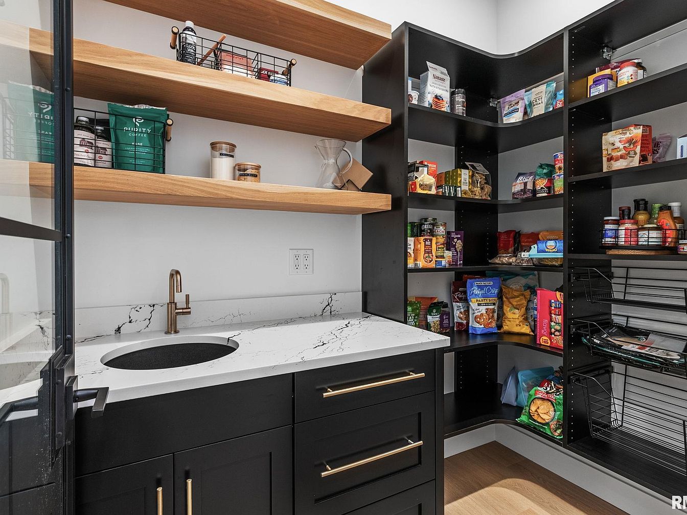 This well-organized pantry features matte black cabinetry with sleek gold hardware, creating a modern and sophisticated look. A white marble countertop with subtle black veining hosts a small round sink with a brushed gold faucet, adding functional elegance. Above the counter, two natural wood floating shelves provide open storage for frequently used items, adding warmth through their rich grain and tone. The corner pantry shelves, also black, are stocked with various dry goods, showcasing ample storage space. Light-colored wood flooring brightens the space, balancing the darker tones and contributing to a clean, contemporary aesthetic.