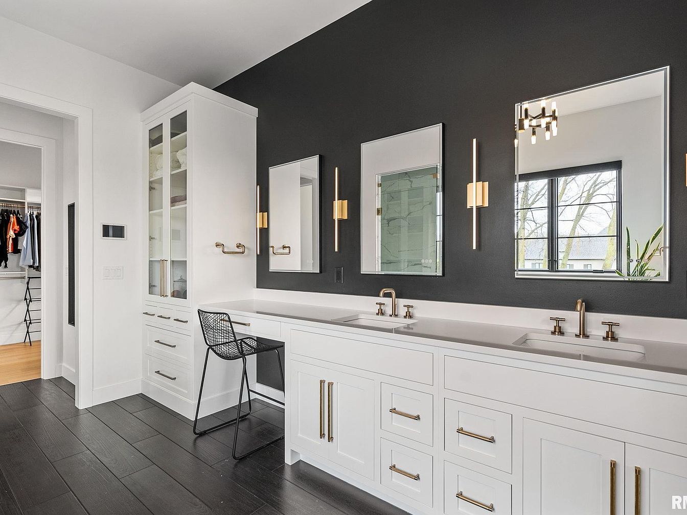 This bathroom features a sleek and modern vanity area with a striking contrast between the dark charcoal accent wall and crisp white cabinetry. The long white countertop includes dual sinks with brushed brass faucets, adding warmth and elegance. Three rectangular mirrors are evenly spaced, each flanked by tall vertical brass light fixtures that provide ambient lighting. The cabinetry below offers ample storage with multiple drawers and polished brass handles. A black metal mesh chair fits neatly under a makeup or sitting area. The floor is covered with dark wood planks, complementing the minimalist, contemporary design.
