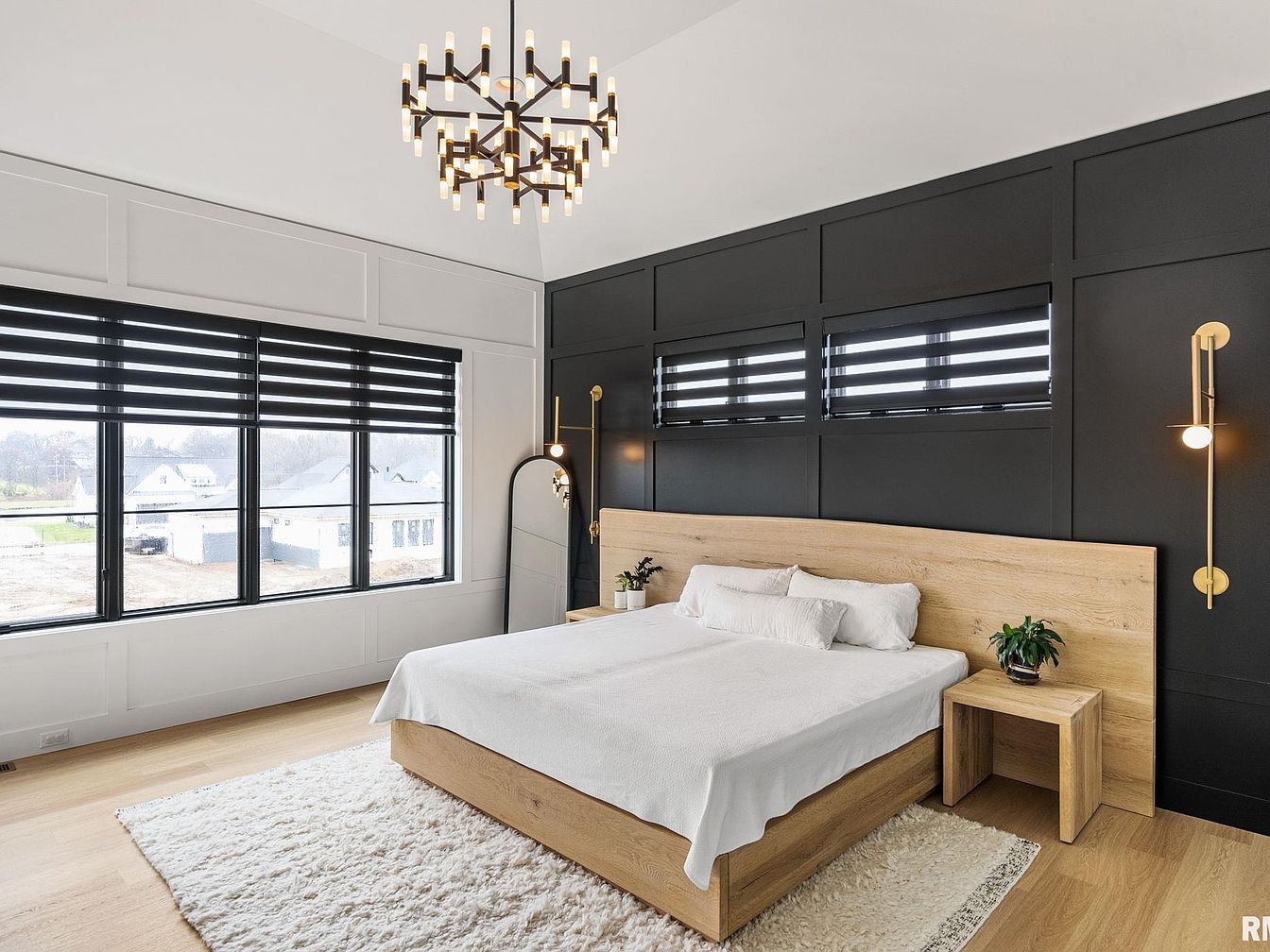 This master bedroom features a sleek, modern design with a neutral color palette and striking contrasts. The back wall is painted matte black with elegant paneling that adds depth and sophistication. A natural wood platform bed and matching floating nightstands deliver warmth and organic texture, complemented by the crisp white bedding and luminous fluffy area rug. Three narrow windows with black horizontal blinds line the black accent wall, while a larger window with similar blinds brings in ample natural light from the opposite side. Gold-tone sconces, a chic standing mirror, and a geometric chandelier with soft, warm lighting round out this stylish, balanced retreat.