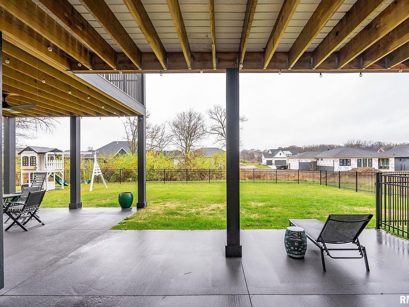 This covered patio area features a sleek concrete floor with sturdy black columns supporting an overhead wooden deck, exposing natural wood beams that add rustic charm. Outdoor string lights hang below the deck, creating inviting ambient lighting for evening gatherings. On one side, a simple black lounging chair faces the spacious green backyard enclosed by modern black metal fencing. Adjacent to the lawn, there is a children’s playset with swings and a playhouse, emphasizing family-friendly living. The overall design balances practical outdoor relaxation with a fresh, open space for both adults and kids.