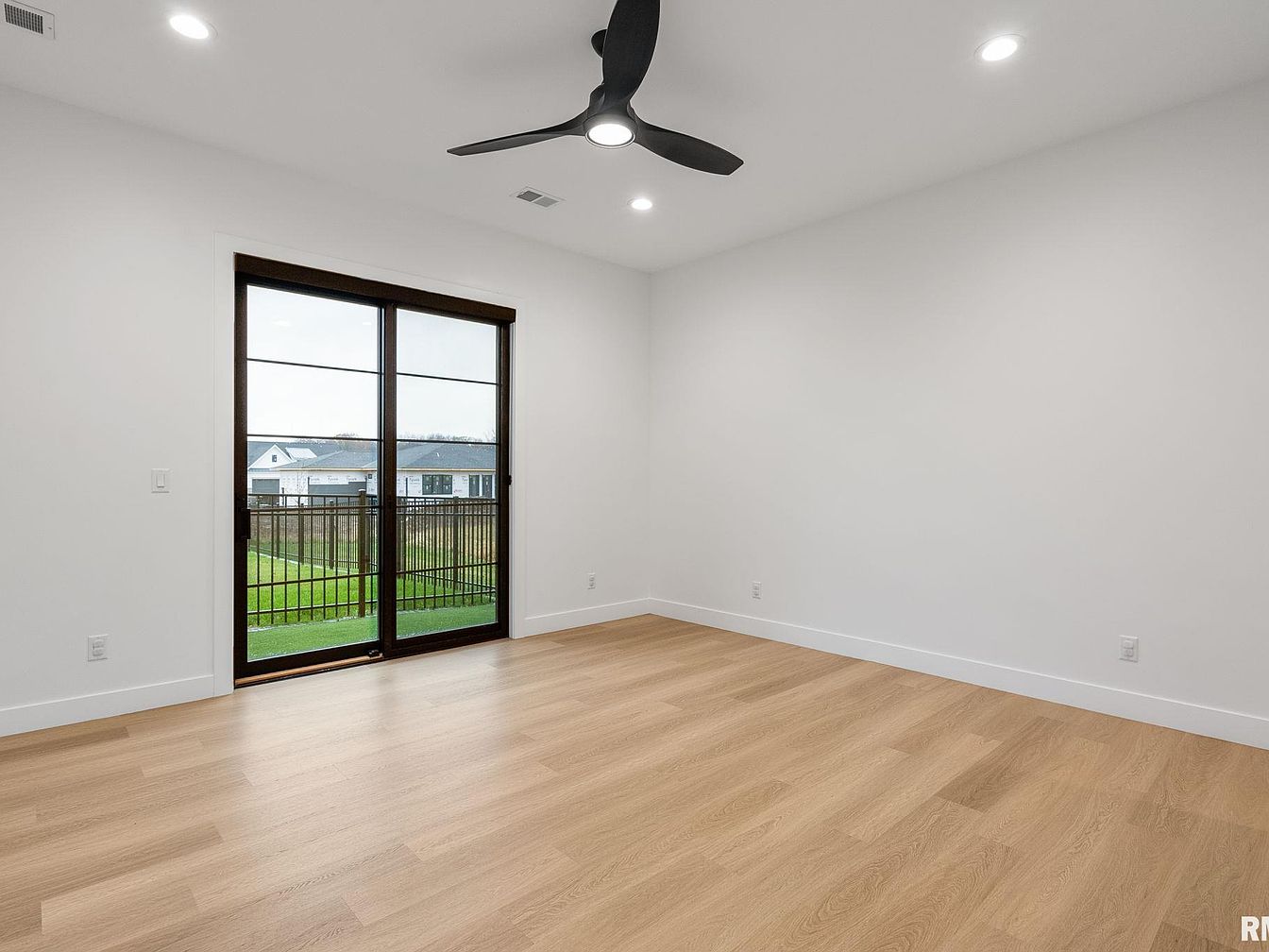 This spacious bedroom features a calming neutral palette with white walls and light oak wood flooring, creating a modern, airy atmosphere. A large sliding glass door framed in dark trim provides direct access to a balcony, flooding the room with natural light and extending indoor living outdoors. The room is topped with a sleek black ceiling fan with integrated light, adding both function and contemporary style. Clean white baseboards provide a polished finish to the room, which is free of clutter, offering a perfect blank canvas for personal furnishings and decor.