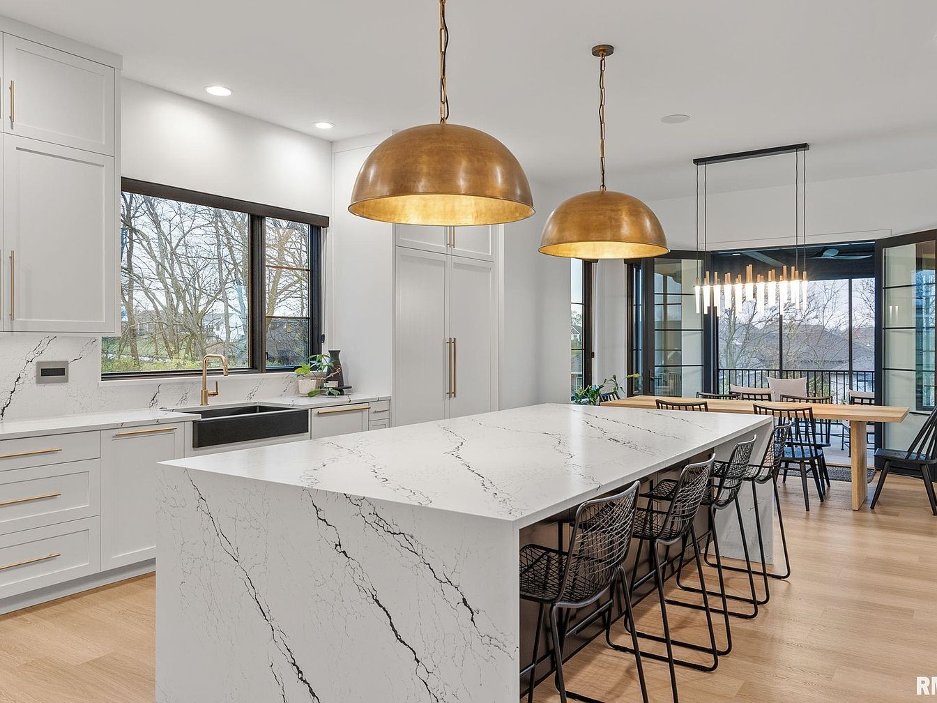 The kitchen features a large white marble island with striking black veining as the focal point, paired with sleek black wireframe bar stools. White cabinetry with gold hardware complements the marble countertops and backsplash, creating a bright, clean aesthetic. Above the island, two oversized brass dome pendant lights add warmth and an elegant contrast. The adjacent dining area has a light wood table surrounded by black chairs, beneath a modern linear chandelier. Large windows and glass doors provide abundant natural light and a seamless connection to outdoor spaces, enhancing the open, airy feel.