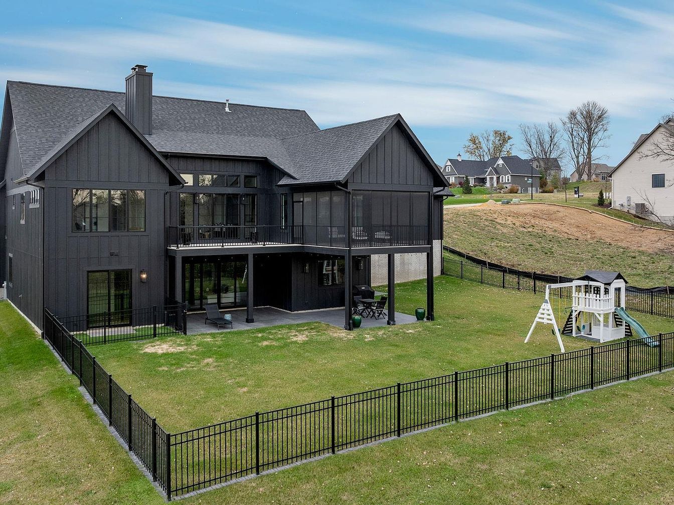 This spacious backyard features a meticulously maintained lawn enclosed by a sleek black metal fence, perfect for safety and aesthetics. The home’s exterior is a modern dark gray with vertical siding that creates a contemporary yet cozy farmhouse feel. A covered patio below and a screened-in porch above provide ample outdoor living options with protection from the elements. Both areas offer opportunities for relaxation and outdoor dining. A children’s playset with a slide and swings adds a family-friendly touch, making this backyard both stylish and functional for various outdoor activities.