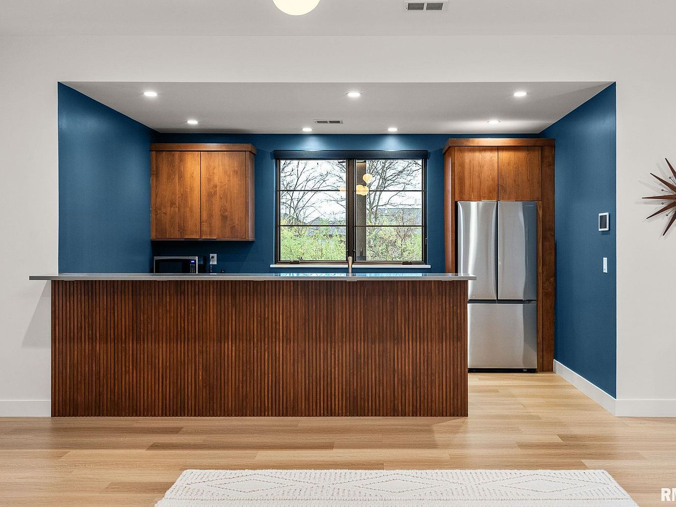 This kitchen presents a modern, streamlined design featuring a rich combination of wood and deep blue walls, creating a warm yet contemporary atmosphere. The space centers around a long, wooden-paneled island with a smooth, light-colored countertop, offering both workspace and a visual anchor. The cabinetry, finished in medium wood tones, complements the textured island and frames the set of windows above the stainless steel sink, allowing natural light to enhance the room. Recessed ceiling lights ensure ample brightness, while the stainless steel refrigerator adds a sleek, polished contrast. Light wood flooring ties the look together, maintaining an open, inviting feel.