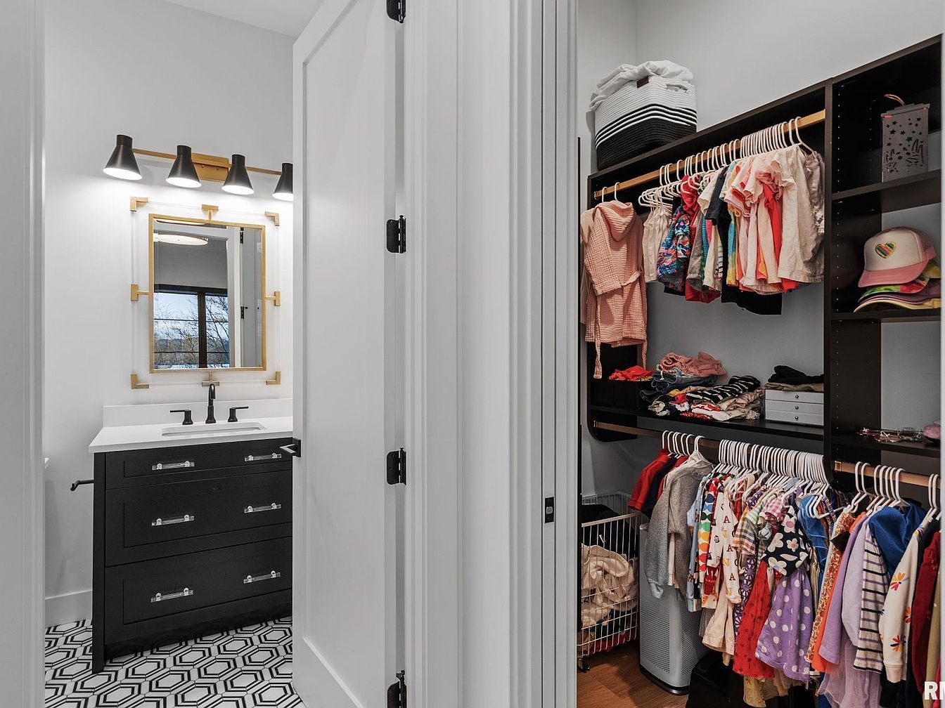 This section features a sleek bathroom vanity in matte black with three drawers, topped by a crisp white countertop and undermount sink, accentuated by black fixtures. Above it, a modern rectangular mirror with a gold-toned frame is illuminated by a four-light fixture in matching black and gold. Adjacent to the bathroom is a well-organized closet with dark wood shelving and dual-level hanging rods, showcasing an array of colorful children’s clothing. The space is brightened by white walls and doors, and the bathroom floor displays a bold geometric black and white tile pattern, balancing functionality with contemporary elegance.