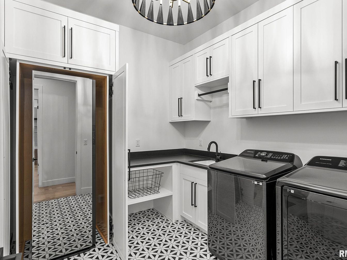 This laundry room features a well-organized and functional layout with a modern aesthetic. White cabinetry with black hardware lines the upper and lower walls, offering ample storage space. The black countertop contrasts sharply with the cabinetry and surrounds a practical sink with a black faucet, ideal for soaking or hand washing. The washer and dryer are black, sleek Samsung models that add to the room’s contemporary feel. A full-length mirror is mounted inside a cabinet door, reflecting the geometric black-and-white patterned floor tiles, which provide a bold and stylish foundation. Clean lines and monochromatic colors emphasize simplicity and elegance in this space.