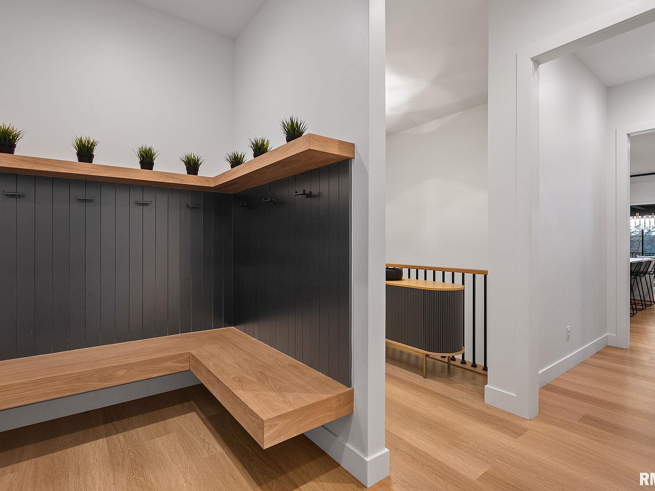 This entryway mudroom features a stylish corner bench with a floating design in natural wood tones that harmonize with the warm, light oak flooring. The back wall is clad in dark charcoal vertical paneling, accented by black metal hooks perfect for hanging coats, bags, or hats. Above the hooks, a suspended wooden shelf is decorated with small green potted plants, adding a touch of nature and freshness to the clean, modern space. Crisp white walls and trim continue beyond, blending seamlessly with adjacent rooms, creating an inviting and organized transition zone for the home.