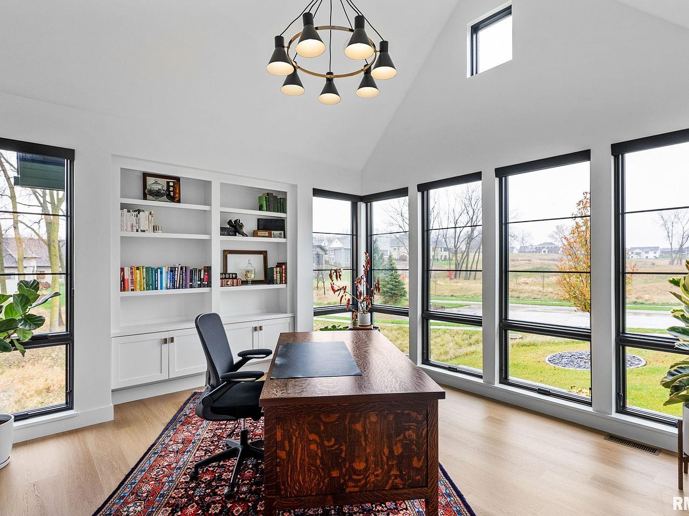 This bright home office features a high vaulted ceiling painted crisp white, emphasizing the spaciousness. The room is defined by large, black-framed windows that flood the space with natural light and offer expansive views of the tranquil outdoors. A rich wooden desk with a dark leather pad anchors the room and sits atop a traditional patterned rug that adds warmth and depth. The built-in white cabinetry against one wall provides ample storage and display space for books and decor, blending modern functionality with elegant simplicity. A contemporary chandelier with matte black and gold accents hangs centrally, adding stylish flair.