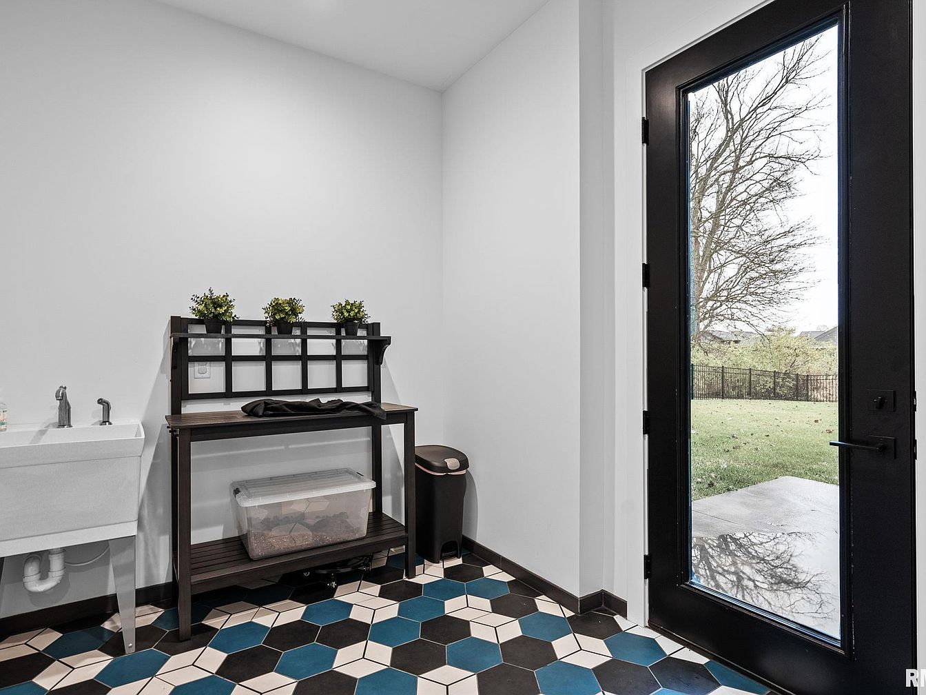 This utility room features a sleek layout with a black-framed glass door allowing natural light and a clear view of the backyard. The floor boasts a geometric pattern in navy blue, black, and white hexagonal tiles, adding a lively, modern touch. A simple white wall contrasts starkly with the black trash bin and dark wood potting bench, which holds small potted plants, suggesting a mix of practicality and subtle greenery. A white utility sink sits to the left, completing this clean, functional space designed for chores while maintaining aesthetic appeal.