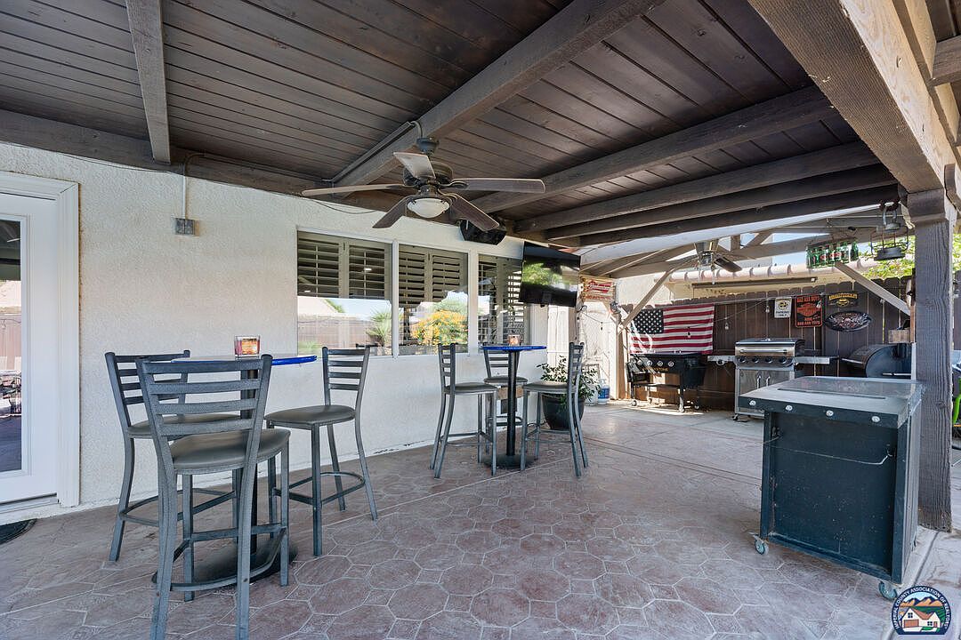 This covered outdoor space blends functionality and comfort with a social vibe. The ceiling features exposed dark wooden beams and a ceiling fan for airflow. The floor is tiled in muted earthy tones with a hexagonal pattern adding subtle texture. There are tall bar-height tables with matching high chairs arranged for casual dining or drinks. A mounted flat-screen TV enhances entertainment options. The area opens to a grilling station under a pergola, complete with a barbecue grill and smoker. An American flag and vintage signage add character to this practical, inviting space for gatherings.
