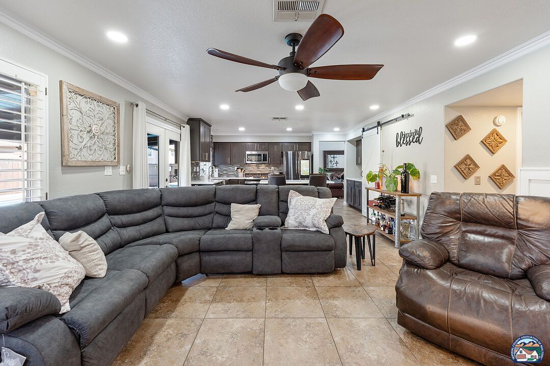 This spacious living area features a large, plush, dark gray L-shaped sectional sofa complemented by a matching leather recliner, creating an inviting space for relaxation. Light beige floor tiles ground the room, enhancing the neutral, cozy color palette. The open concept flows seamlessly into a contemporary kitchen with rich dark cabinetry, stainless steel appliances, and a glossy backsplash, blending modernity with comfort. Ceiling recessed lights and a sleek ceiling fan with wooden blades provide functional illumination. Decorative accents, including a carved wooden wall art piece, plants, and a small bar cart, add warmth and character to this stylish, family-friendly space.
