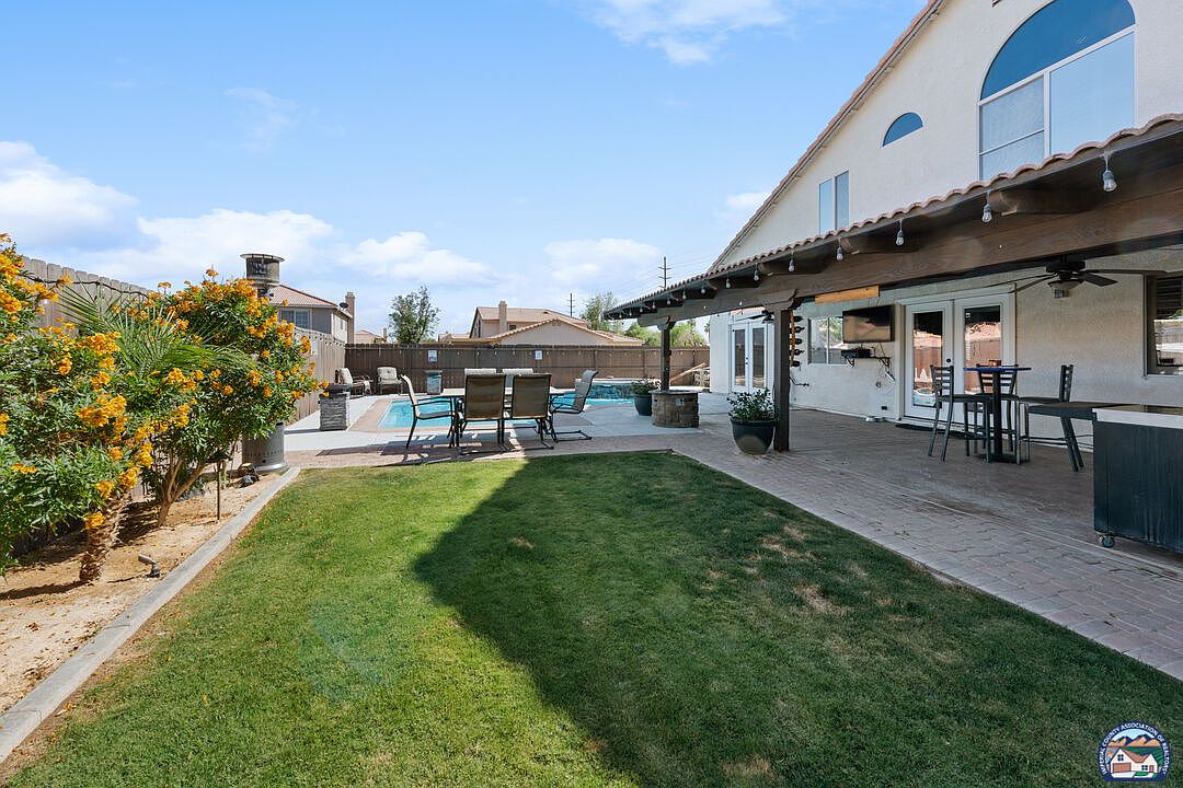 This inviting backyard features a spacious patio covered by a wooden pergola with string lights enhancing the ambiance for evening gatherings. The patio extends along the home’s exterior, which is characterized by light-colored stucco walls and large windows, including a striking arched window on the upper floor. Outdoor furniture includes a set of dining chairs around a table closer to the pool, perfect for al fresco meals. The pool is centrally located, surrounded by a clean concrete deck. A small grassy lawn adds greenery, framed by flowering shrubs and a wooden fence enclosing the space, creating a private and cheerful outdoor retreat.