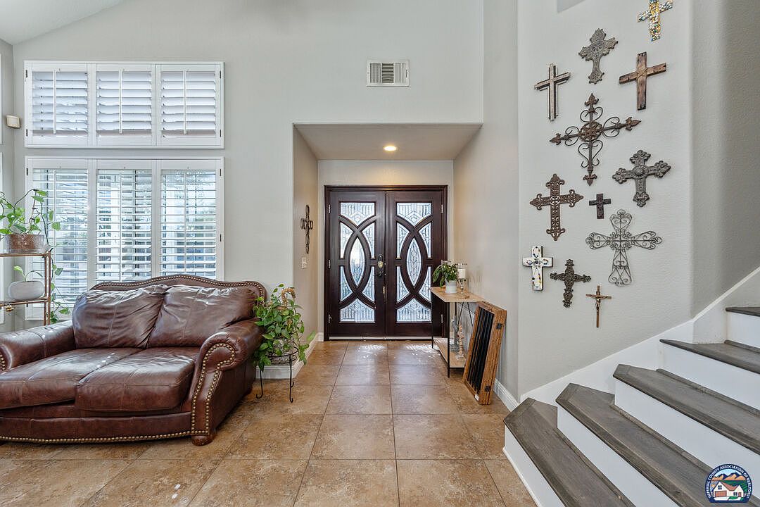 This inviting entryway features double front doors with an intricate geometric glass design, creating an elegant focal point. The floors are covered in large, polished beige tiles that add warmth and continuity to the space. Adjacent to the entry, a deep brown leather couch with nailhead trim anchors the living area, complemented by large white plantation shutters that flood the room with natural light. A tasteful gallery of decorative crosses decorates the wall by the staircase, adding character and a personal touch. The staircase itself has modern gray-tinted wooden steps with white risers, contributing to a clean, transitional aesthetic.