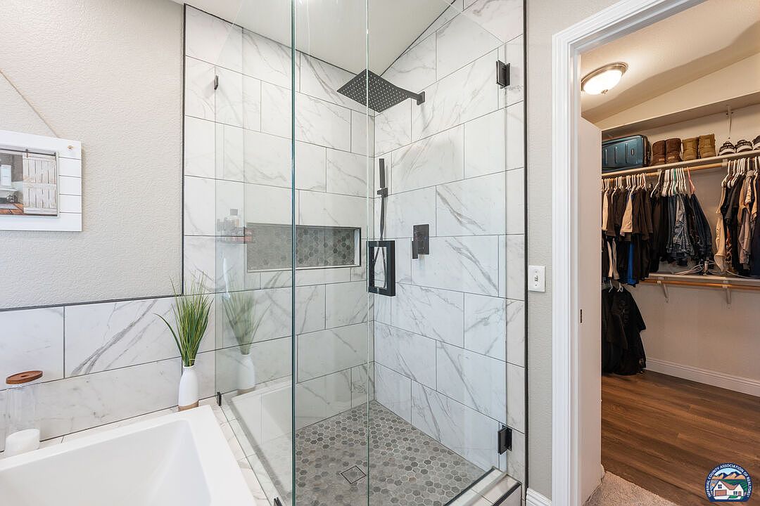This bathroom features a modern, sleek design with a glass-enclosed shower highlighted by large, white marble tiles with subtle gray veining. The shower floor contrasts with hexagonal mosaic tiles in neutral tones, adding texture and interest. Adjacent to the shower is a white bathtub with marble paneling, complemented by a simple white vase holding green foliage for a touch of nature. Soft gray walls provide a muted background. A doorway leads into a spacious walk-in closet with wood-look flooring, organized shelving, and hanging clothes visible under warm, recessed lighting, enhancing the functional flow.