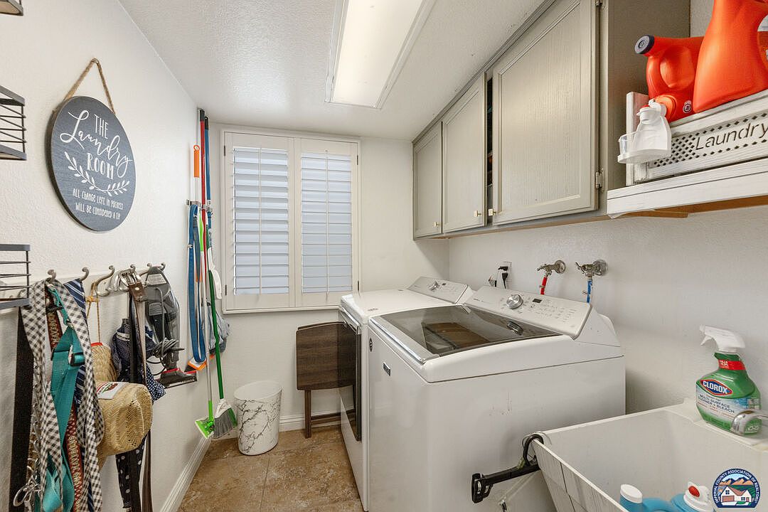 This compact laundry room is thoughtfully arranged to maximize utility within a narrow space. The white washer and dryer sit side by side under muted beige cabinetry with brushed nickel hardware, offering clean storage above. A practical utility sink is installed adjacent to the appliances, complemented by cleaning supplies organized on a shelf. The space benefits from natural light filtered through plantation shutters on the window, brightening the room while maintaining privacy. A rack with hooks on the opposite wall neatly holds leashes, hats, and cleaning tools, enhancing order and functionality. The floor features durable stone tiles in earthy tones, balancing practical design with a warm, welcoming atmosphere.