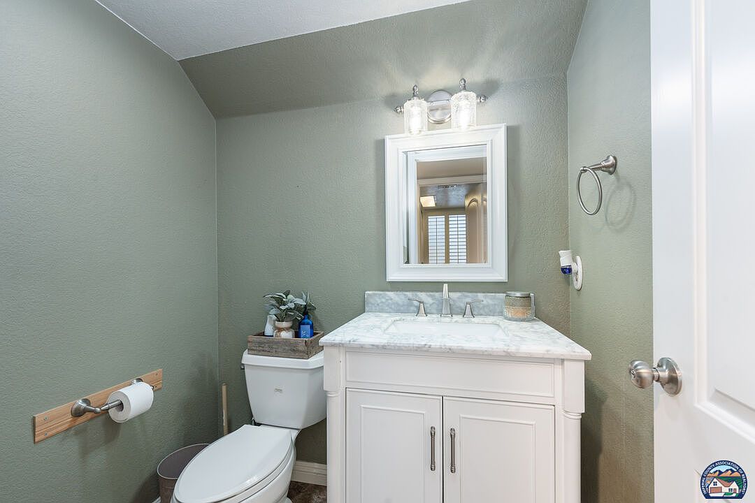 This compact bathroom features a muted sage green wall color that provides a calming atmosphere. A white vanity with a marble countertop anchors the space, complemented by modern silver hardware and a matching faucet. Above the vanity, a rectangular white-framed mirror is illuminated by a dual-light fixture with textured glass shades, enhancing the overall brightness. The white toilet is adorned with a wooden tray holding small decorative plants and toiletries, adding a touch of natural greenery. Simple accessories include a silver towel ring and a wooden-backed toilet paper holder, contributing to the bathroom’s clean and understated elegance.