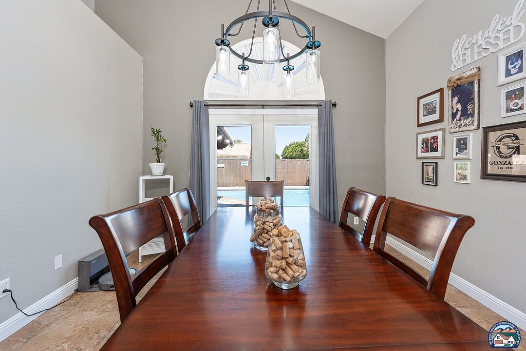 This dining room features a long wooden table with a polished finish, surrounded by six matching chairs with curved backs. The walls are painted in a soft gray tone, creating a neutral backdrop that complements the rich wood furniture. Natural light floods the space through French doors topped by an elegant arched window, offering a view of the outdoor pool area. A modern chandelier with exposed bulbs hangs above the table, adding a contemporary touch. On one wall, a gallery of framed photos and decorative signs adds a personal and warm atmosphere, while gray curtains frame the doorway, enhancing the room’s cozy, inviting aesthetic.