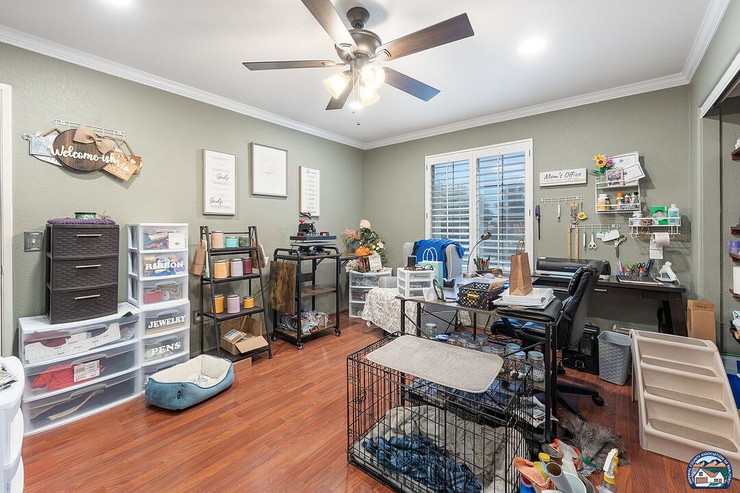 This well-lit home office and craft room features soft green walls contrasted by white crown molding and baseboards for a clean, classic look. The flooring is a warm wood laminate that adds a cozy, inviting feel. A large window with white plantation shutters allows ample natural light, enhancing the bright, airy atmosphere. Functional storage is a primary focus, with multiple plastic drawer organizers, shelves, and a rolling cart neatly housing crafting supplies, tools, and office materials. Furniture includes a comfortable black office chair and a black metal table, creating a productive and organized workspace, with a wire pet crate and accessories adding a personal, lived-in touch.