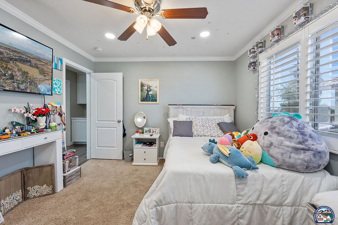 This inviting bedroom features a soft and muted color palette with light gray walls and beige carpet, creating a calm and cozy atmosphere. A white bed dressed with neutral bedding and patterned pillows serves as the focal point, complemented by a collection of playful stuffed animals adding a touch of warmth and personality. Large windows with white plantation shutters allow abundant natural light to fill the room. The ceiling has a white fan with wooden blades, while a wall-mounted TV and a white desk with decorative items enhance functionality. Subtle décor elements, like framed art and small collectibles, bring charm to the space.