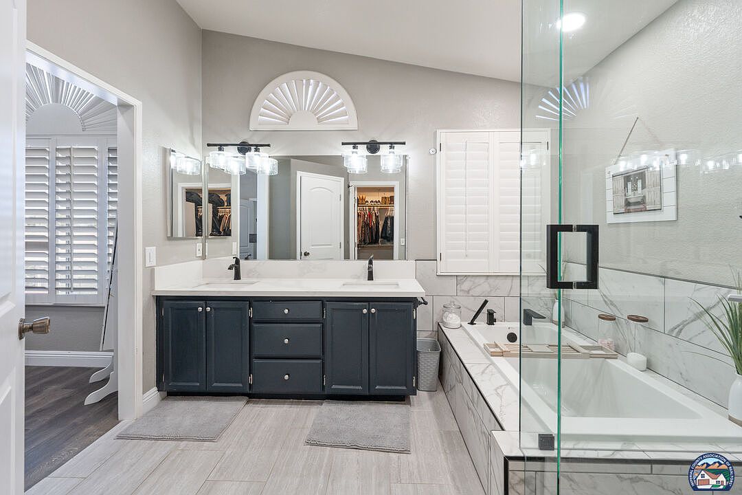 Bright and airy, this bathroom features a dual-sink vanity with deep navy cabinets contrasted by a crisp white countertop. Above the sinks, two rectangular mirrors are framed by elegant lighting fixtures, each with three clear glass shades, providing ample illumination. A semi-circular decorative window treatment adds architectural interest above the mirrors. Adjacent to the vanity is a spacious soaking tub, surrounded by marble-like tiles that extend along the bathtub enclosure and half the wall, enhancing the room’s sophisticated aesthetic. White plantation shutters provide privacy while complementing the neutral gray and white palette throughout the space.