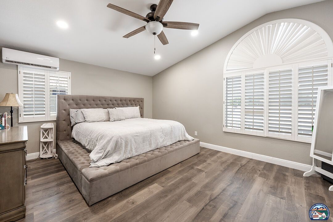 This spacious master bedroom features a neutral color palette dominated by soft gray walls and warm wood-toned flooring that enhance the room’s serene atmosphere. A large, tufted bed with plush upholstery anchors the space, complemented by multiple pillows and a coordinating white duvet. Natural light floods through elegant white plantation shutters on both a rectangular and a distinctive arched window, adding charm and architectural interest. A ceiling fan with wood blades provides both style and function. Minimalist furnishings, including a bedside table and a standing mirror, complete the uncluttered yet inviting design.