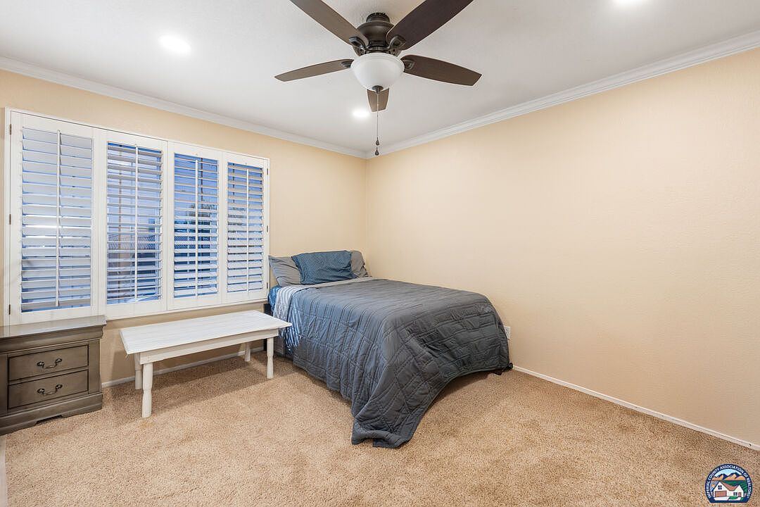 This cozy bedroom corner features a neutral palette with beige walls and matching carpet that create a warm, inviting atmosphere. A comfortable twin-sized bed is dressed in dark grey bedding, complemented by pillows in muted tones, placed against the wall near a large window with white plantation shutters allowing for adjustable natural light. Adjacent to the bed is a simple white bench and a dark wood two-drawer nightstand. Overhead, a ceiling fan with dark blades adds functional charm while maintaining the room’s clean and minimal aesthetic, emphasizing comfort and simplicity.