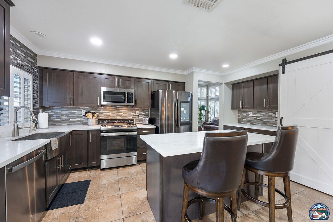 This kitchen features a contemporary layout with dark wood cabinetry contrasted by sleek white countertops. Stainless steel appliances, including a built-in microwave, dishwasher, oven, and a large refrigerator, blend seamlessly into the design. A central island with matching dark wood base offers additional workspace and seating with two high-back leather chairs. The backsplash displays a tasteful mosaic of grey, white, and chrome tiles, complementing the neutral tile flooring. Recessed ceiling lights create bright, even illumination, while crown molding adds a touch of elegance. A white sliding barn door opens into an adjacent room, enhancing the modern farmhouse aesthetic.