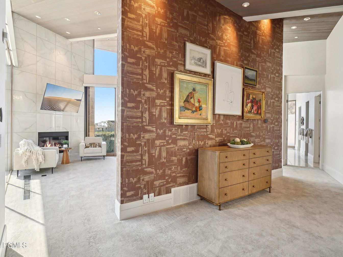 This entry hall leads directly into a bright living room, designed with a modern and warm aesthetic. The entry wall showcases a textured brown wallpaper with gold undertones, accented by an eclectic gallery of framed artwork above a simple wooden dresser. The layout is open, with light beige carpeting flowing seamlessly into the adjoining space. The living room features tall, sleek marble walls with subtle veining, housing a contemporary gas fireplace beneath a mounted flat-screen TV angled for easy viewing. Two light-colored armchairs flank a small wooden side table, all illuminated by abundant natural daylight streaming through large windows, emphasizing airy spaciousness and clean lines throughout.