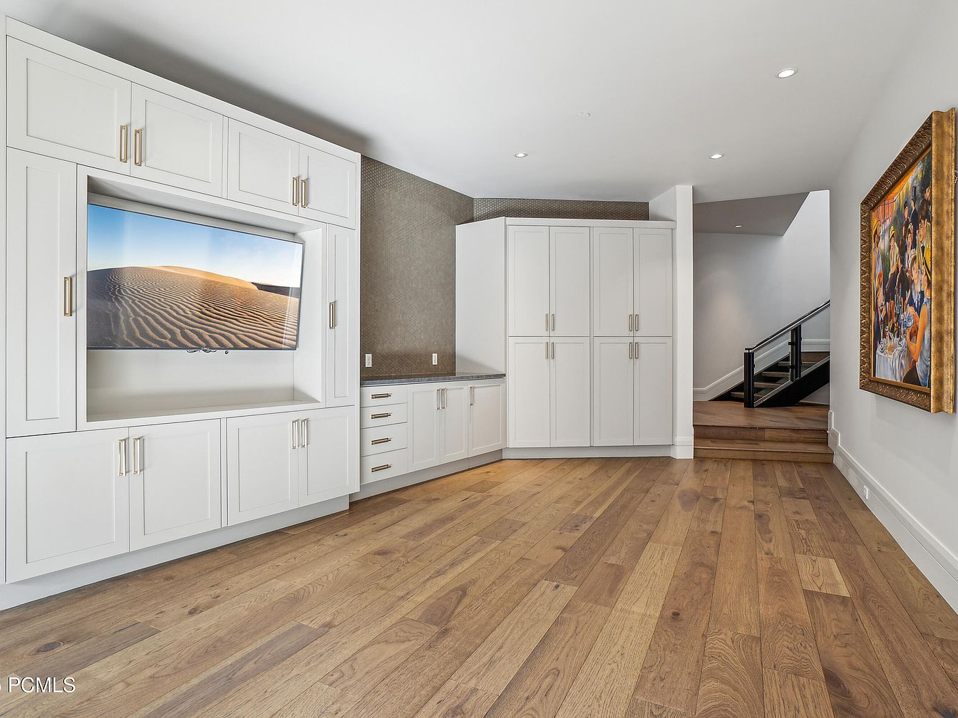 This space features built-in white cabinetry with a modern, clean design, combining storage with media functionality. A large flat-screen TV is set into the wall unit, framed by shaker-style cabinet doors with sleek brass handles. The cabinetry extends around the corner offering additional countertop and cupboard space. Light wood flooring adds warmth and natural texture to the otherwise crisp white and neutral-toned room. Soft recessed lighting brightens the area while a detailed painting in an ornate frame adds a pop of color and artistic touch. A stairway with a black railing is visible, suggesting a transition to other rooms.
