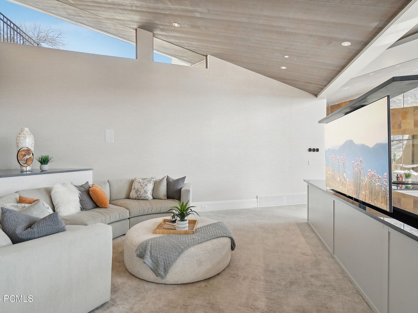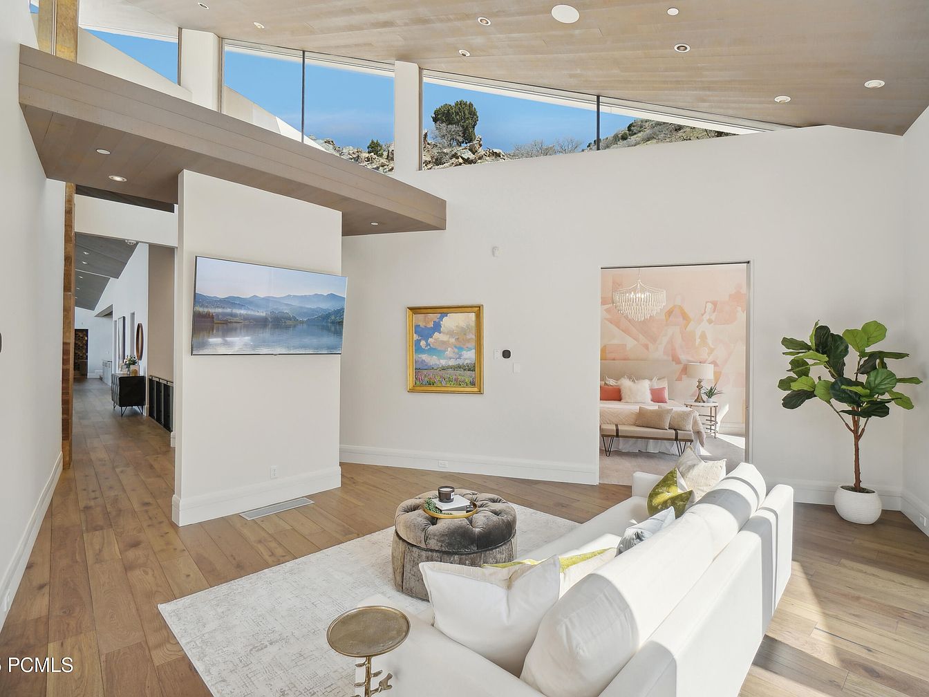 This living area features a modern open layout with high, angled ceilings clad in light wood panels, enhancing the spacious feel. A large, narrow window near the ceiling invites natural light and mountain views, contributing to a serene atmosphere. The white walls pair elegantly with warm-toned wooden flooring, creating a soft, neutral palette that complements the white sofa adorned with white and green accent pillows. A round, tufted ottoman serves as a coffee table on a light area rug. Minimalist decor includes a framed landscape painting and a large potted plant, while a wall-mounted flat-screen TV anchors the room, adding entertainment functionality.