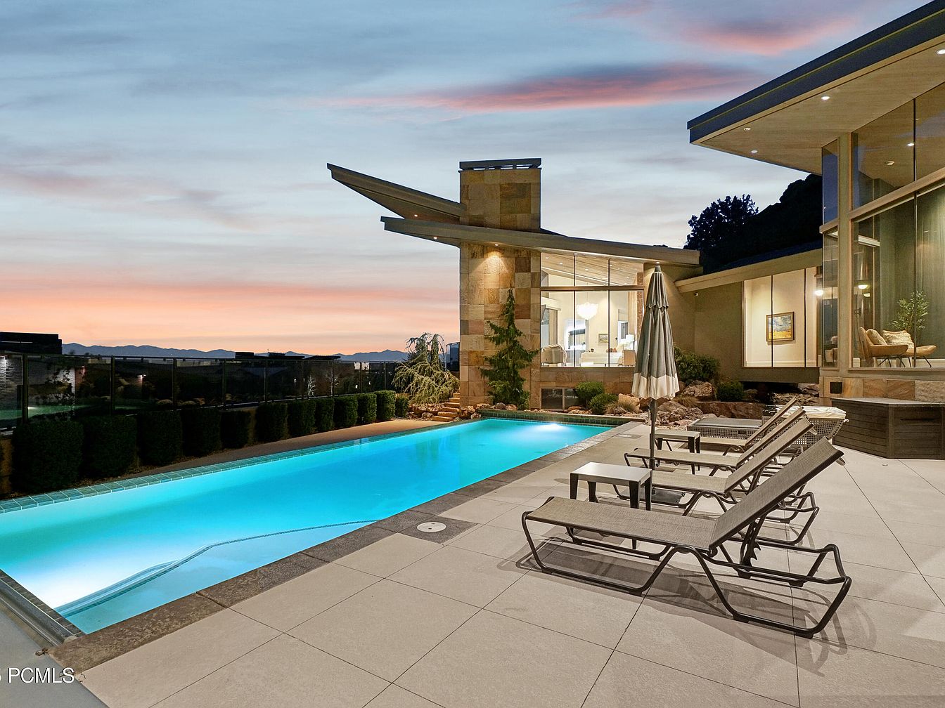 This sleek outdoor pool area features a long, narrow swimming pool with soft, ambient underwater lighting that creates a tranquil and inviting atmosphere at dusk. The surrounding patio is surfaced with large, light-gray tiles, complementing the natural stone and glass architecture of the adjacent home. Four modern lounge chairs and a closed umbrella are arranged neatly along the poolside, offering relaxation spots with unobstructed sunset views. The design balances natural elements with clean lines, large windows allowing visibility into the warm, illuminated interior, and minimal yet functional landscaping framed by manicured hedges and distant mountain silhouettes.