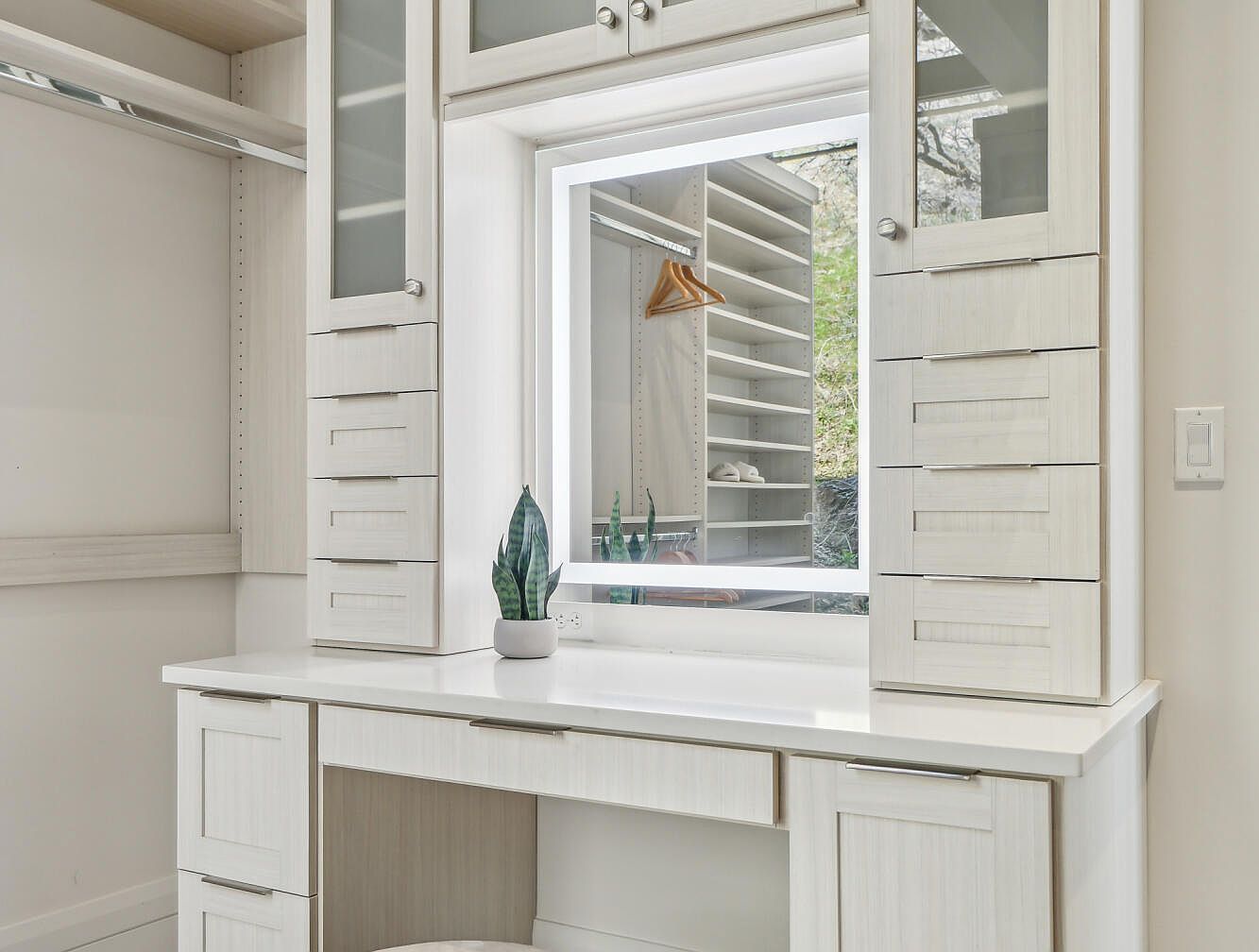This elegant dressing room corner features a built-in vanity with a sleek white countertop, surrounded by light-toned cabinetry that combines functionality with clean aesthetics. The cabinetry includes multiple drawers and glass-paneled upper cabinets, offering ample organized storage. A large mirror with integrated lighting provides bright, even illumination, enhancing grooming tasks. The space is minimalistic yet refined, highlighted by subtle details like brushed metal drawer pulls, and a small potted plant adding a touch of greenery. The neutral palette of whites and soft wood textures promotes a calm, bright atmosphere, optimal for daily preparation.