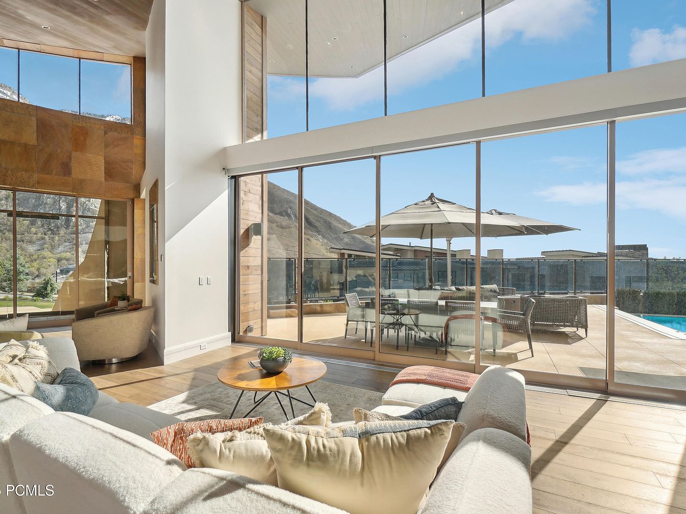 This living room features soaring ceilings and expansive floor-to-ceiling windows that flood the space with natural light, offering breathtaking views of the outdoor patio and surrounding mountains. The room centers around a cozy, curved sectional sofa adorned with plush, neutral-toned pillows that add warmth and comfort. A mid-century modern round wooden coffee table with slender black legs anchors the area. The flooring is a light wood that complements the muted, earth-toned walls and stone accents near the entrance. Sliding glass doors open seamlessly to the outdoor seating area, creating a harmonious indoor-outdoor flow.