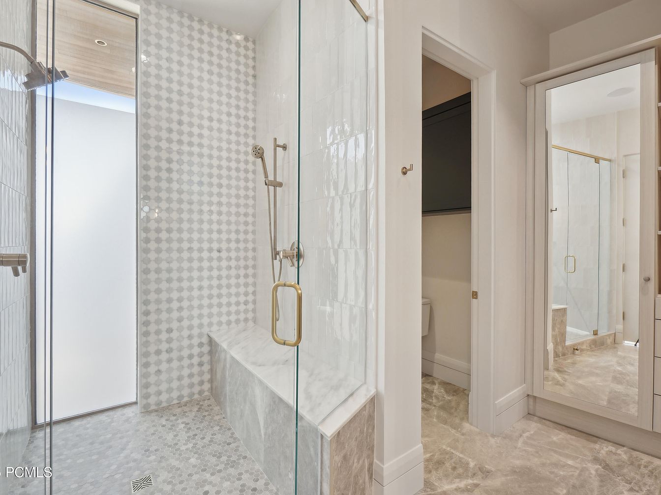 This bathroom section features a spacious walk-in shower enclosed by clear glass, showcasing a blend of patterned and solid tiles. The floor and lower wall are adorned with small hexagonal light grey tiles, while the back wall presents a subtle geometric pattern in soft grey and white. The shower has a built-in marble bench and a modern metallic handheld showerhead. Adjacent to the shower is a mirrored built-in cabinet that provides practical storage, complementing the neutral color palette of whites, greys, and beige tones throughout the polished, marble-look tiled floor, evoking a clean, elegant atmosphere.