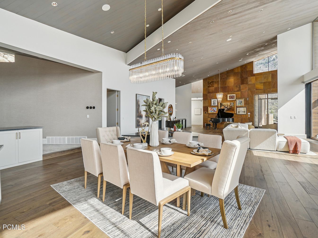 This open-concept space blends dining and living areas with modern sophistication. The dining area features a rectangular wooden table surrounded by eight upholstered cream chairs placed on a muted striped rug. Above the table hangs a contemporary crystal chandelier suspended from a vaulted ceiling clad in light-toned wood planks. Beyond the dining area, the living space includes cream-colored modular sofas accentuated by a soft throw, arranged near floor-to-ceiling windows letting in abundant natural light. A distinctive wall with warm, rust-colored paneling serves as a backdrop for a sleek black grand piano and a curated gallery of framed artwork, adding a creative and elegant touch to the room’s overall airy and bright aesthetic.