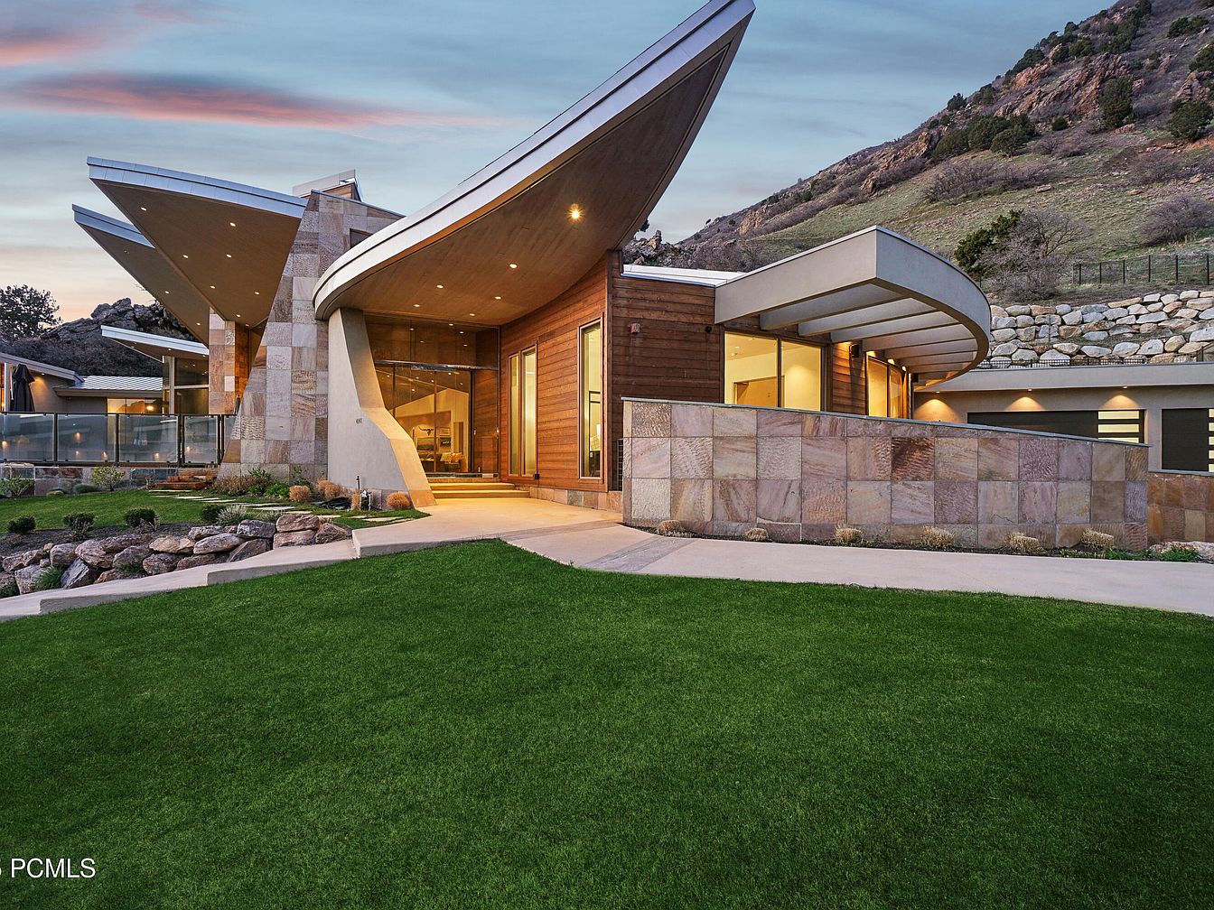 This striking exterior showcases contemporary architectural design featuring sharp, angular rooflines that curve dramatically upward, giving the home a dynamic and sculptural appearance. The combination of natural materials like warm-toned wood siding and earth-colored stone tiles enhances its integration with the surrounding mountainous landscape. The expansive glass entryway invites natural light inside while creating a seamless indoor-outdoor connection. The well-maintained green lawn and stone-bordered garden beds add lushness to the front area, balancing the bold geometric forms with organic softness. Soft outdoor lighting accentuates the home’s textures and shapes as evening falls.