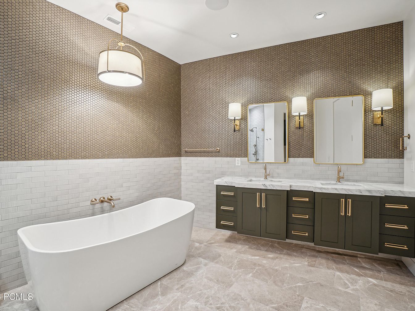 This bathroom features a sophisticated design with a freestanding white bathtub positioned against a wall with dual-textured tiling. The upper half of the walls are covered in small, hexagonal tiles with a gold-bronze metallic sheen, contrasting with smooth white rectangular tiles below. A large double vanity with dark olive-green cabinetry and elegant gold hardware sits opposite the tub, topped with a polished marble countertop. Two rectangular mirrors with slim gold frames hang above two modern gold faucets, each paired with a wall-mounted sconces emitting soft white light. The floor has neutral-toned marble tiles, and a large ceiling pendant light complements the warm, contemporary ambiance.