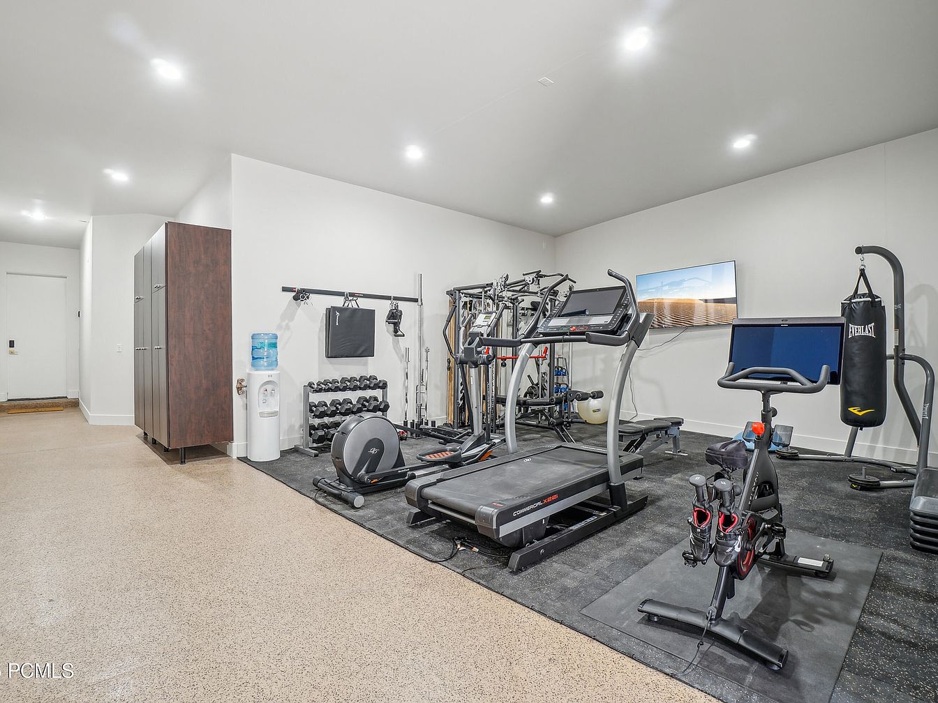 This spacious home gym features a minimalist design with white walls and a light, speckled floor that contrasts effectively with dark gym mats beneath the equipment. The layout is practical, with a range of exercise machines including a treadmill, stationary bike, rowing machine, and a multi-functional weight lifting station arranged for easy movement. A punching bag hangs on the right, enhancing workout variety. The room is well-lit with recessed ceiling lights, while a sleek wall-mounted TV offers entertainment. Dark wooden storage cabinets provide neat organization, complementing the clean, modern aesthetics of the space.