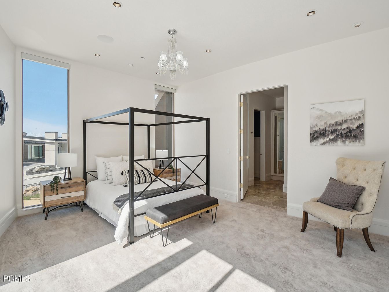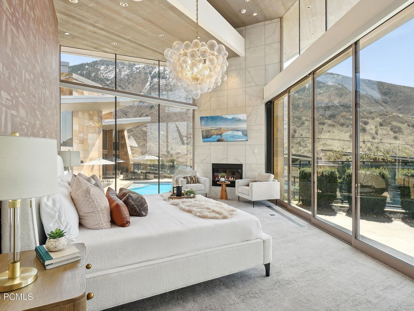 This luxurious master bedroom features floor-to-ceiling glass walls that frame stunning mountain and pool views, creating a seamless connection to the outdoors. The space is designed with a neutral color palette, including soft beige carpeting and an upholstered platform bed dressed in white linens and a mix of textured pillows. A chic, round chandelier with translucent globes hangs from the high ceiling, adding a sculptural focal point. Opposite the bed, two modern armchairs flank a minimalist gas fireplace set in a polished stone wall, complemented by a mounted landscape artwork. Warm wood tones subtly accent the mid-century modern bedside table and ceiling, enriching the calm, airy ambiance.