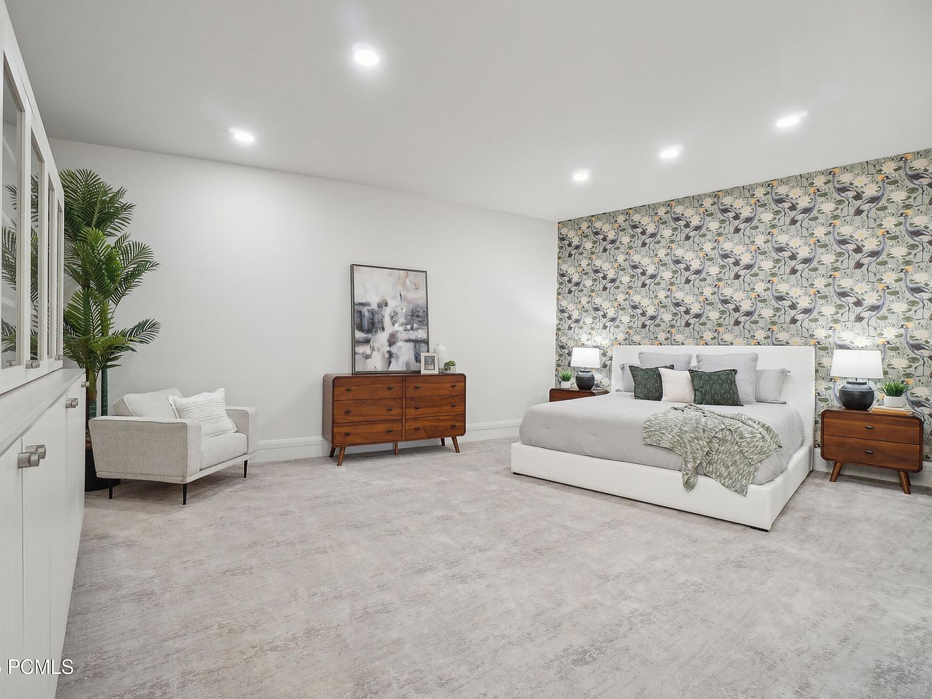 This spacious master bedroom combines minimalist elegance with a touch of playful personality. The carpeted floor in soft gray complements the predominantly white walls, except for one accent wall behind the bed featuring a chic wallpaper adorned with whimsical bird and floral patterns. A large white upholstered bed anchors the room, paired with matching wooden nightstands topped with modern black lamps. Across from the bed, a mid-century modern wooden dresser is decorated with art, and a cozy light-gray armchair is situated beside a tall, leafy green plant. Recessed lighting ensures a bright, inviting ambiance.