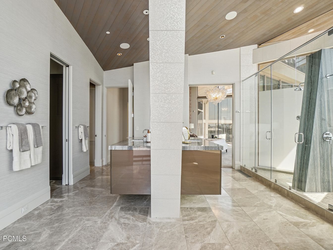 This master bathroom features a spacious layout with polished stone flooring and modern, sleek design elements. The focal point is a central pillar separating two floating vanities with marble countertops, adding symmetry and luxury. To the right, a large glass-enclosed shower with contemporary fixtures highlights the commitment to spacious, high-end finishes. The walls are clad in soft neutral tones that complement the beige and cream marble floor while enhancing natural light from the nearby bedroom. A wood-paneled ceiling in a muted, warm tone adds depth and warmth, creating an inviting yet modern atmosphere.