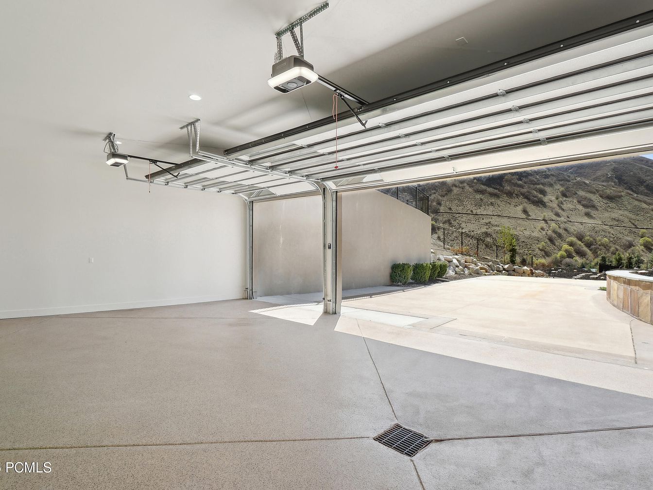 This spacious garage features a clean and modern design with smooth, light-tone epoxy flooring and white walls that enhance brightness. The ceiling is fitted with two automatic garage door openers and recessed lighting, contributing to a streamlined, functional space. The large open garage doors offer a seamless transition to the expansive concrete driveway outside, bordered by a natural stone retaining wall on one side and greenery next to a hillside with shrubbery. The overall look is minimalist and practical, emphasizing ample room for vehicles and easy outdoor access.