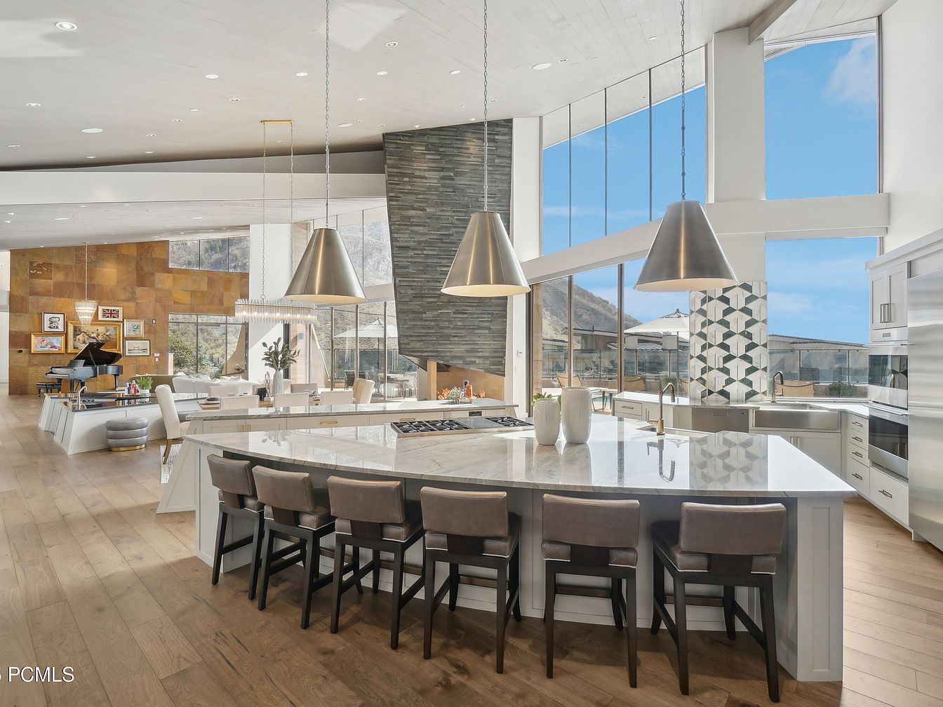 This expansive open-concept kitchen seamlessly connects to the living space, framed by massive floor-to-ceiling windows that flood the area with natural light and showcase stunning mountain views. The kitchen features a large, white marble island with ample seating of six dark leather stools, creating a perfect blend of functionality and elegance. Overhead, three metallic pendant lights add a touch of modern sophistication. Light wooden floors extend throughout, complementing the clean white cabinetry and stainless steel appliances. A distinctive angled stone fireplace serves as a dramatic centerpiece between the kitchen and living area, where plush white chairs and tasteful artwork enhance the contemporary yet cozy ambiance.