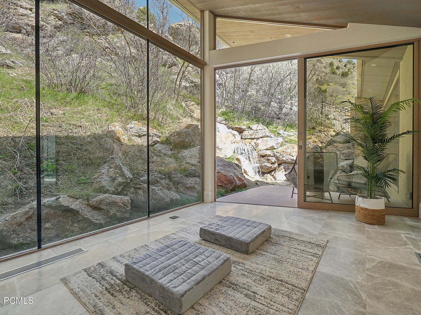 This serene sunroom features floor-to-ceiling glass walls that immerse the space in natural light and provide an unobstructed view of the rocky hillside and delicate foliage outside. The flooring is polished stone tile in neutral tones, which complements the soft, textured area rug. Two cushioned floor seats in muted gray invite relaxation, enhancing the minimalist design. A large potted plant adds a touch of greenery indoors, echoing the natural theme. The sliding glass door leads to a patio area, seamlessly blending indoor and outdoor living, perfect for peaceful contemplation or quiet reading.